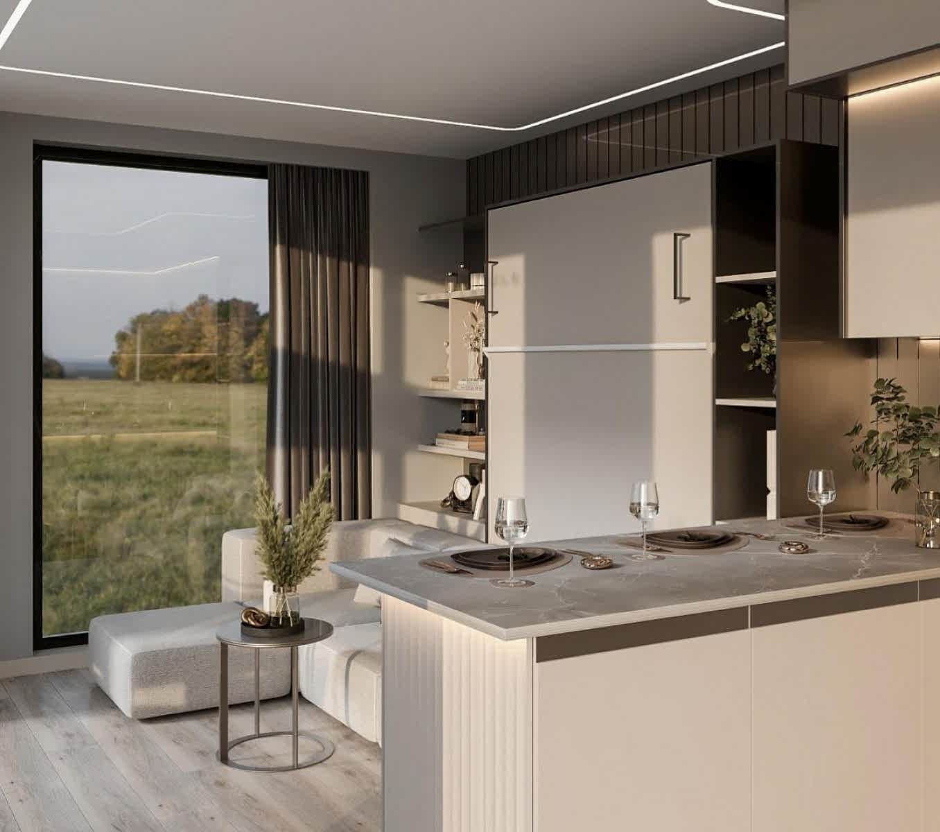 - İç Mekan: İç duvarlar ahşaptır ve oturma odasında duvardan açılabilir bir yatak mekanizması bulunmaktadır. Yer döşemesi standart parkedir. Mutfak tezgahı akrilik malzemeden yapılmıştır.